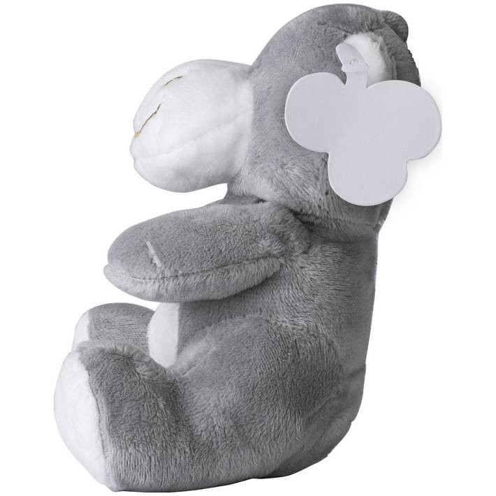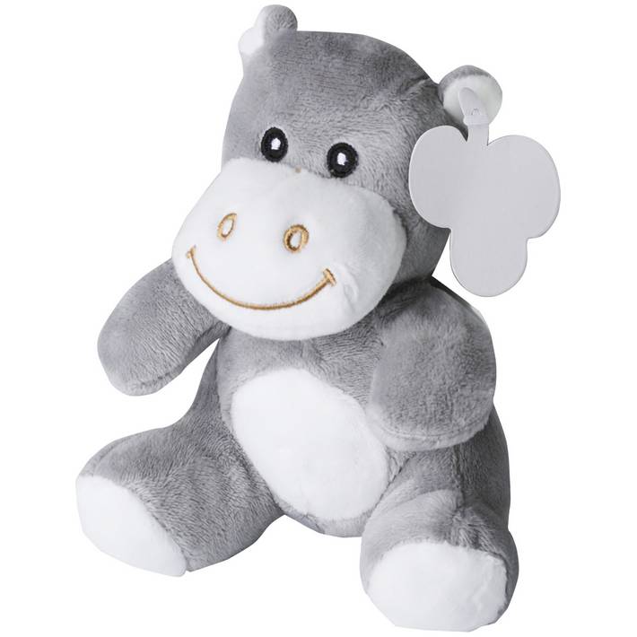 Nilpferd aus Plüsch. Mit gestickten Augen. Enthält einen Anhänger zum Bedrucken.