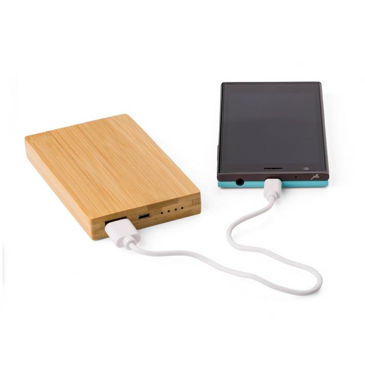 Powerbank aus Bambus mit 4000 mAh Kapazität, 5V/1000 mAh Ein- und Ausgangsleistung, zwei USB-Ports und Verbindungskabel (USB).Mindestmenge
