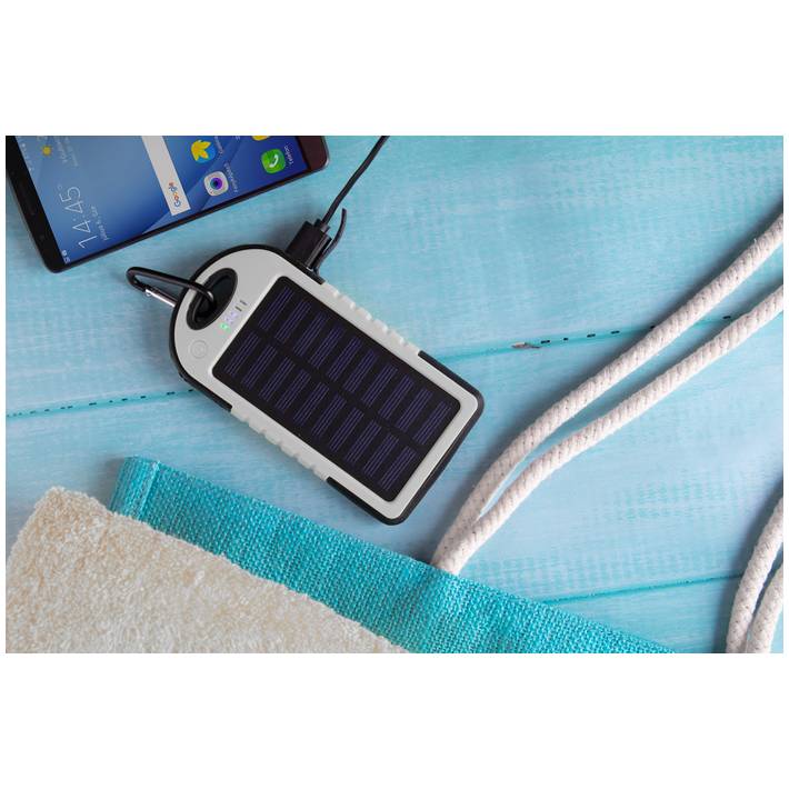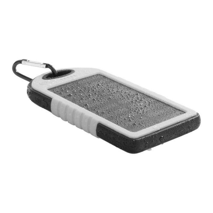Powerbank aus Kunststoff mit Silikonmantel, Kapazität: 4000 mAh, Solar-Ladefunktion und 1 LED Lampe. Inkl. USB-Ladekabel mit Micro-USB-Stecker.Mindestmenge