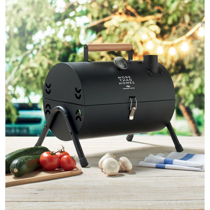 Tragbarer BBQ Grill aus Eisen mit Rauchabzug und Temperaturanzeige. Pulverbeschichteter Korpus. Tragegriff aus Holz.Mindestmenge