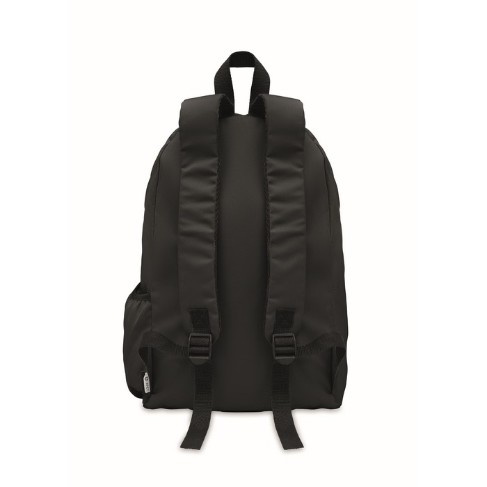 Rucksack mit Reißverschluss-Außentasche. Gepolsterter Rücken und seitliches Flaschenfach. 600D RPET-Polyester.Mindestmenge