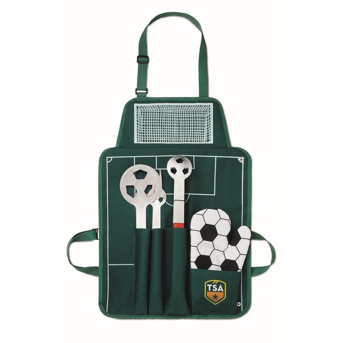 Fußball Grillschürze mit Zange, Gabel, Grillwender und Topfhandschuh. Alles im Fußball Design. Schürze aus 600D Polyester.Mindestmenge