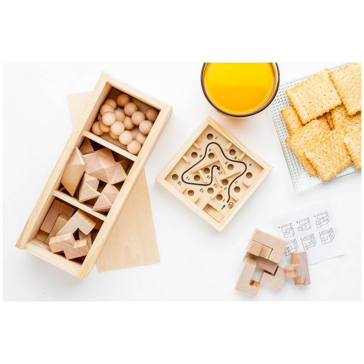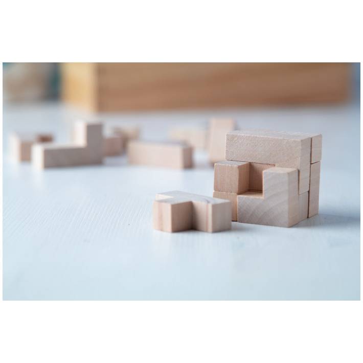 Geduldspiel aus Holz, ergibt einen Würfel. Einzeln im Baumwollbeutel (100 x 170mm).