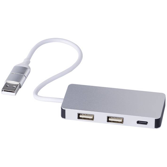 Aluminium USB Hub with 3 ports. Two USB A, one USB C port. Recycled logo engraved on the front.