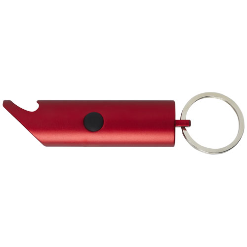 Bright LED keylight with bottle opener, power on/off button and a split iron keyring. It is made of lightweight and strong 63% RCS certified recycled aluminium. The Recycled Claim Standard (RCS) verifies the recycled content of a product throughout the entire supply chain. Available in a variety of striking colours with a metallic finish, making a printed logo stand out nicely. Comes with three LR44 batteries.Minimum quantity: