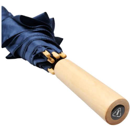 Alina 23" auto open recycled PET umbrella. Automatic opening umbrella with a recycled PET pongee polyester canopy. Sturdy metal shaft, a high quality frame with fibreglass ribs offering flexibility in windy conditions. Together with the wooden handle, tips, and the recycled PET pongee polyester canopy it offers a sustainable choice. Available in a wide variety of contemporary colours with an large decoration area on each of the panels, and the wooden handle can be decorated too. Recycled PET Pongee polyester.Minimum quantity:
