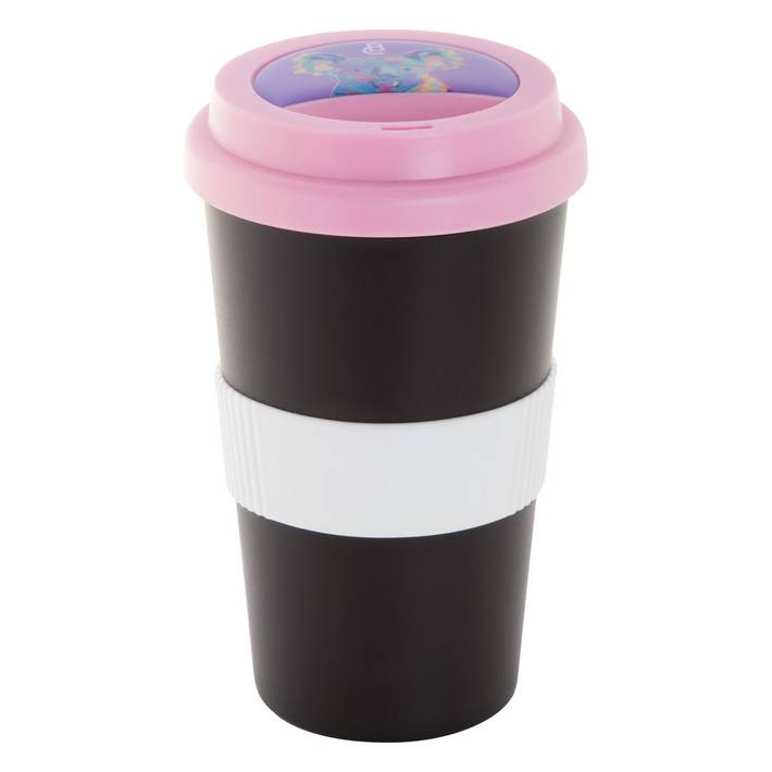 Customisable, double-wall plastic thermo mug with drinking lid and silicone grip. 400 ml. MOQ: 50 pcs.