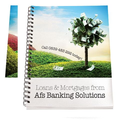 Desk-Mate® A4 spiral notebook. Includes 50 sheets blank paper (80 g/m2) and front cover (450g/m2). The cover is tear- and waterproof. Full colour print is possible to the cover and each sheet.Minimum quantity: