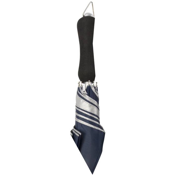 Automatic polyester (210T) umbrella with eight panels. Silver coloured underside. Metal frame and foam handle. Push button close.Minimum quantity: