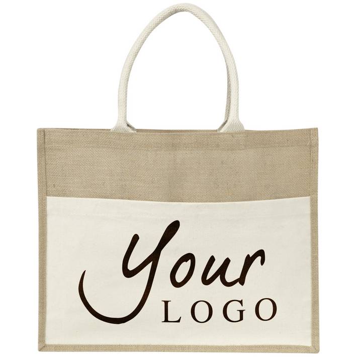 Jute bag with plastic backing, a cotton front pocket, and padded carry handles.