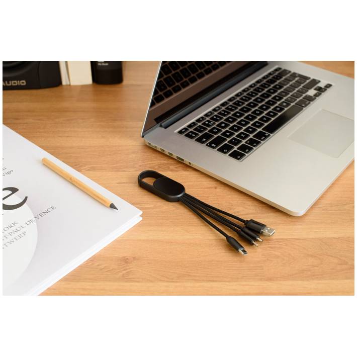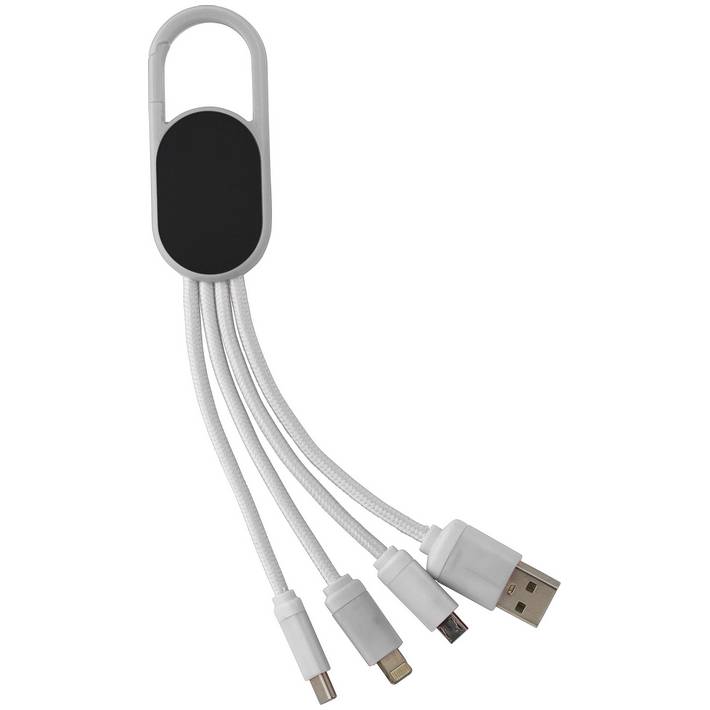 4-in-1 Charging cable set with a hook. The set has a USB, USB-C, micro USB, and Lightning plug. After laser engraving, the logo lights up when the cable is in use.Minimum quantity: