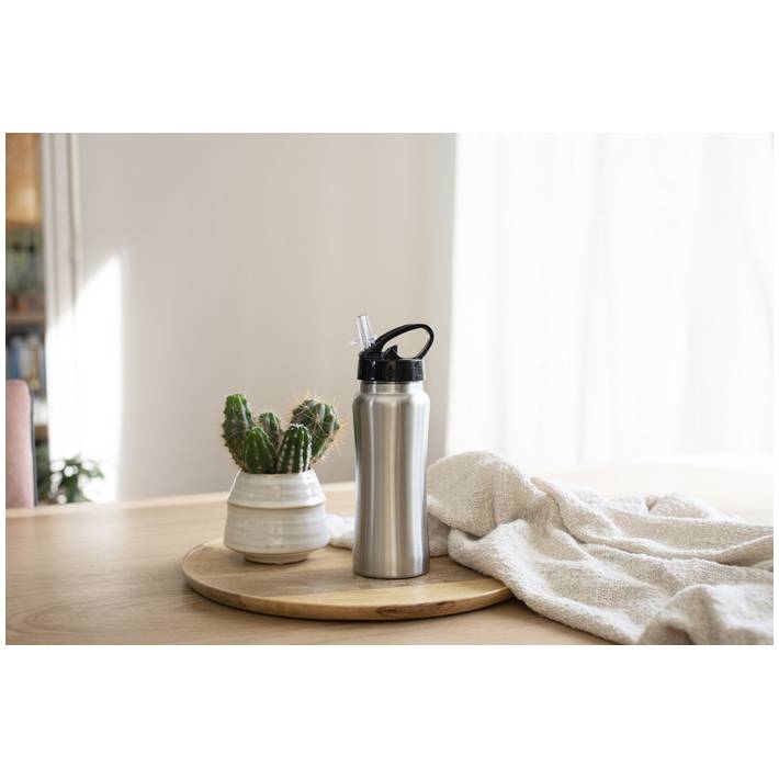 Stainless steel (s/s304) bottle (600 ml). With plastic cap and foldable drinking spout. (Outside stainless steel 201 / inside stainless steel 304)Minimum quantity: