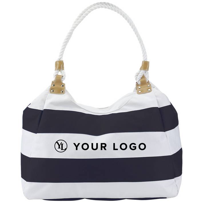 Polyester (600D) beach bag with rope handles and zipper.