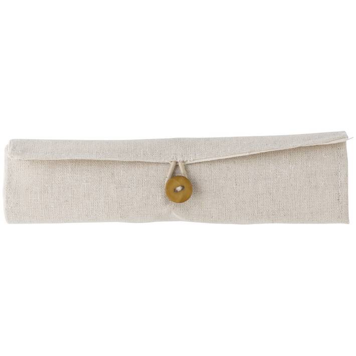 Cotton roll-up pouch with stationary set. Including: bamboo ruler, wooden pencil sharpener, eraser, pencil, and ballpen with blue ink.Minimum quantity: