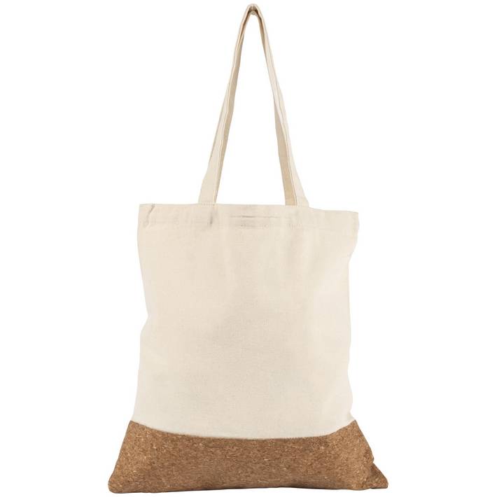 Cotton (250 gr/m²) shopping bag with cork fabric. The handles are 58 cm long.