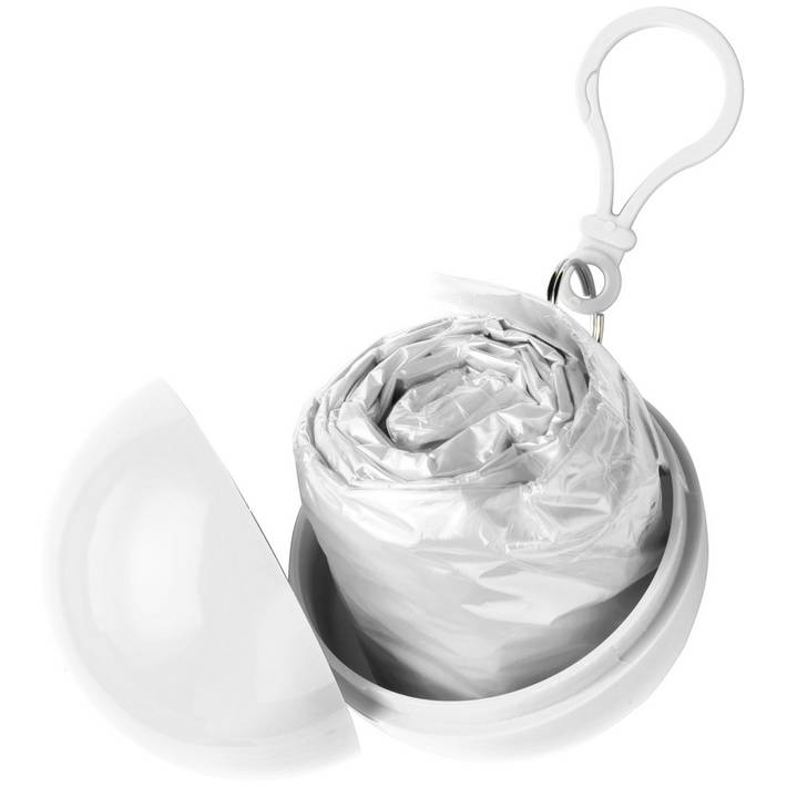 PVC Poncho in an ABS plastic ball with a snap hook attachment.