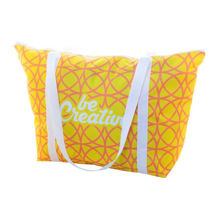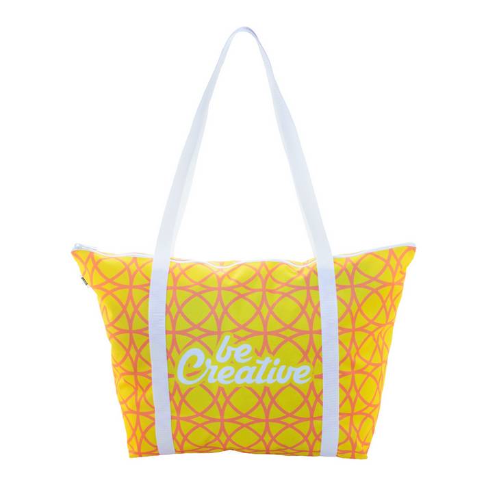Custom made, zipped beach bag in 600D RPET polyester with long handles. With all over sublimation printed graphics and distinctive RPET label. MOQ: 50 pcs.Minimum quantity: