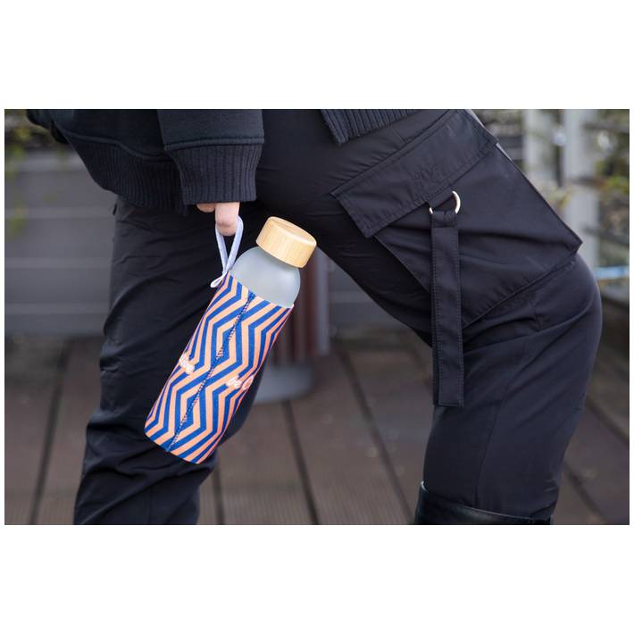 Glass bottle with bamboo cap in custom made, RPET felt pouch with full colour printed graphics and distinctive RPET label. Price includes sublimation printing. 500 ml. MOQ: 50 pcs. Not suitable for carbonated drinks.Minimum quantity: