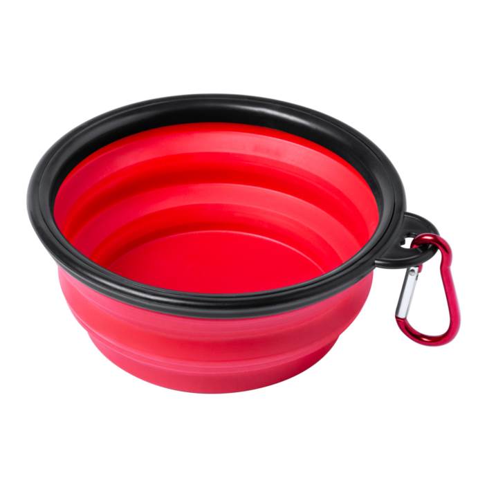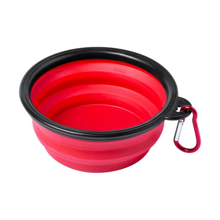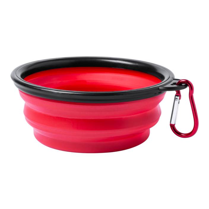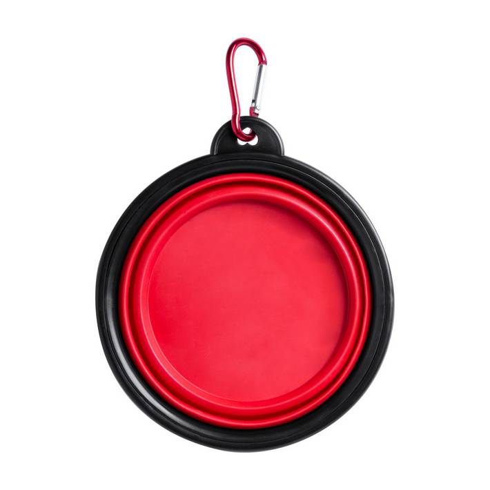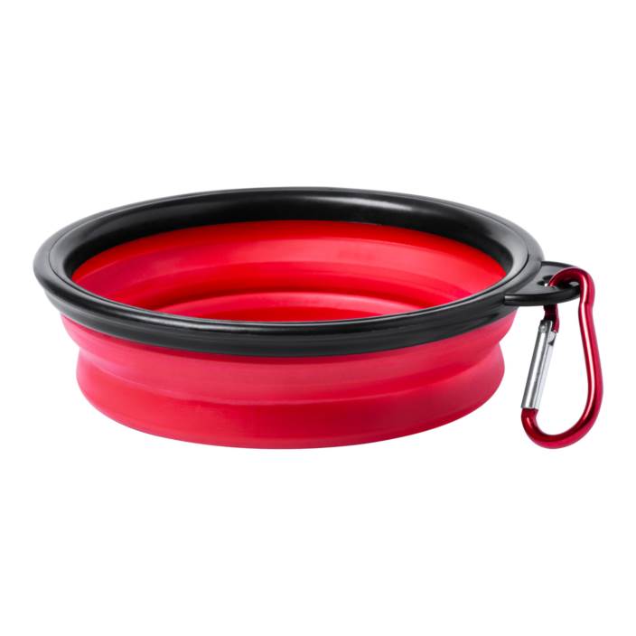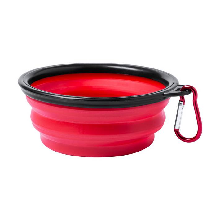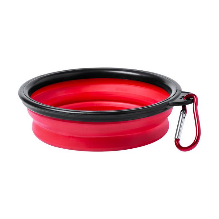 Portable, foldable dog bowl with carabiner.