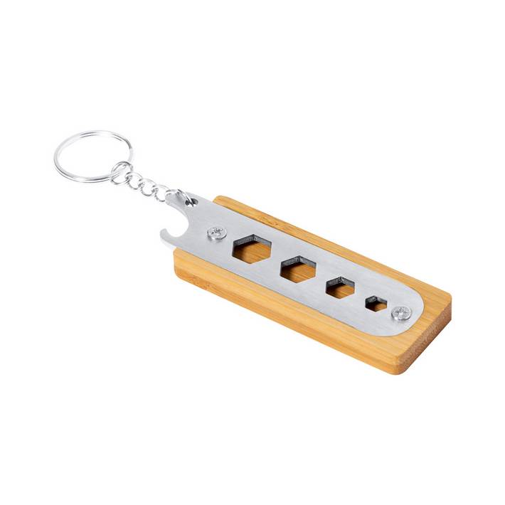 Bamboo and stainless steel multi-tool keyring with bottle opener and 4 hexagonal wrench slots.