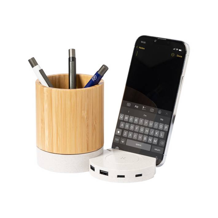 Multifunctional pen holder in bamboo and ecological wheat straw plastic. With mobile phone holder, wireless charger (5W) and 3-port USB hub (2 USB and 1 USB-C ports, USB 2.0). Including USB charger cable.Minimum quantity: