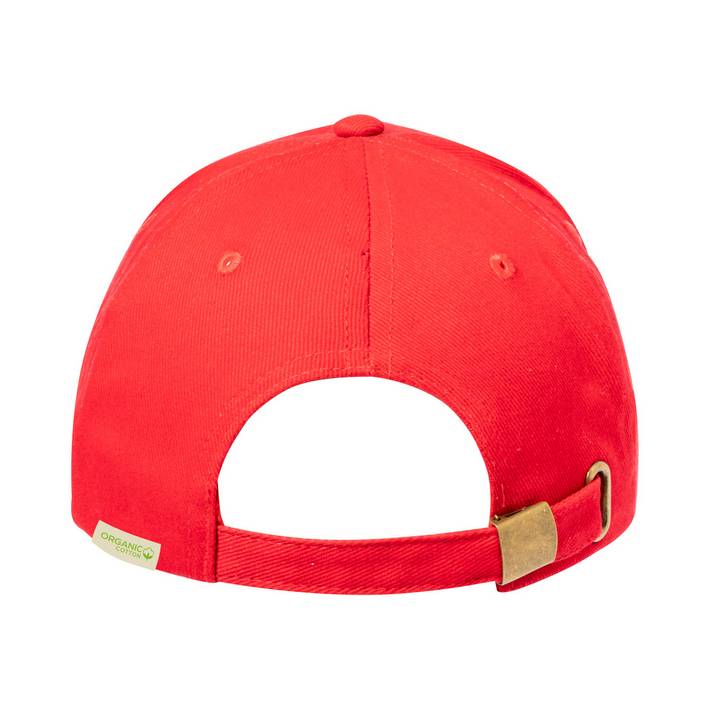 Organic cotton baseball cap with 5 panels and metal buckle closure.