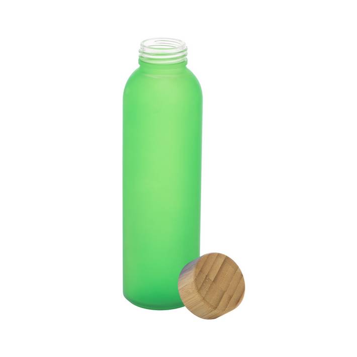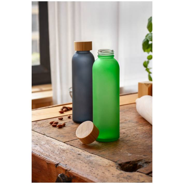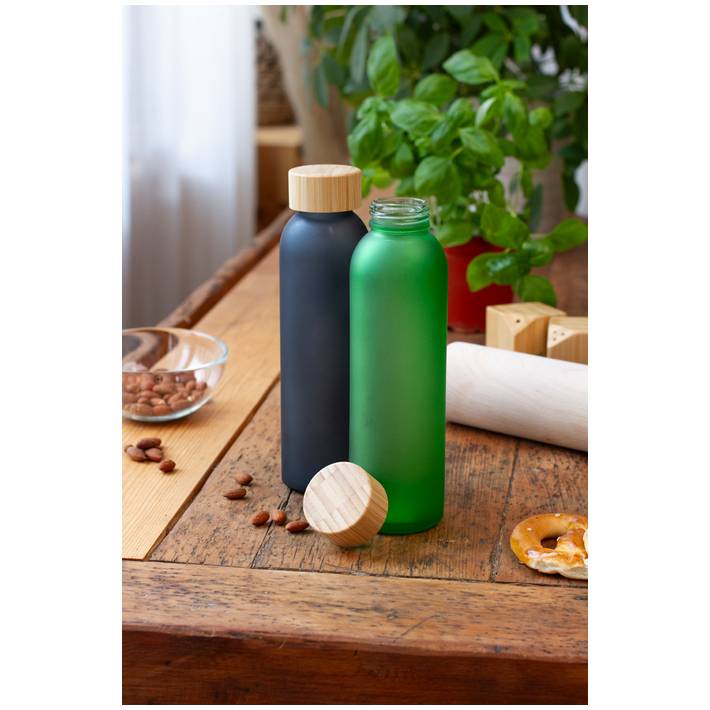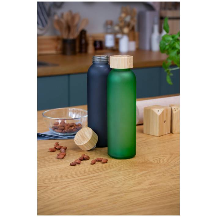 Frosted glass bottle with bamboo cap, 500 ml. Not suitable for carbonated drinks.