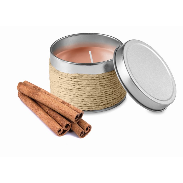 Fragranced candle in decorative tin box.