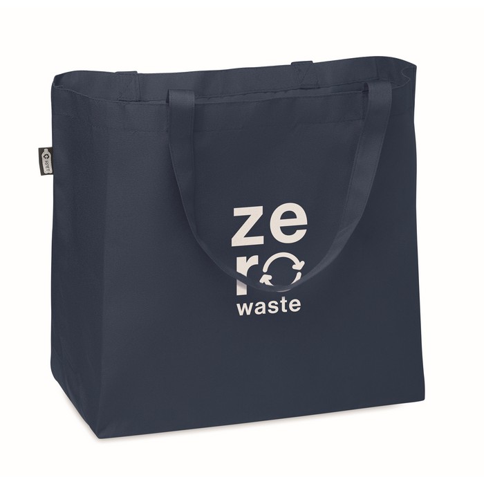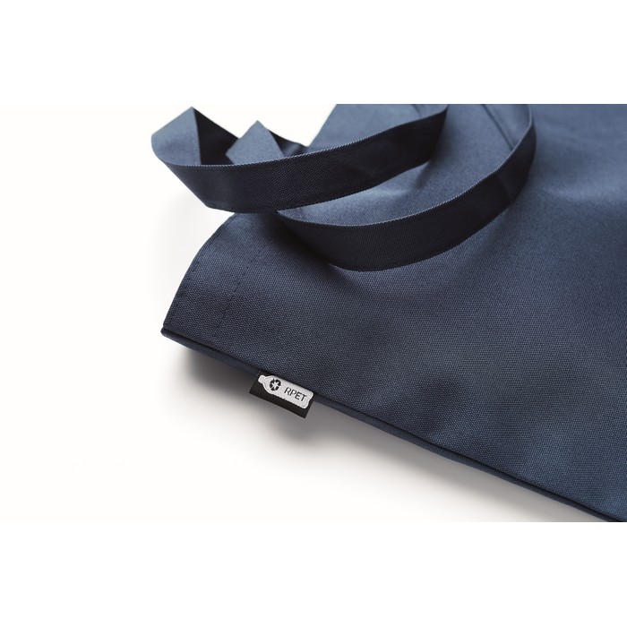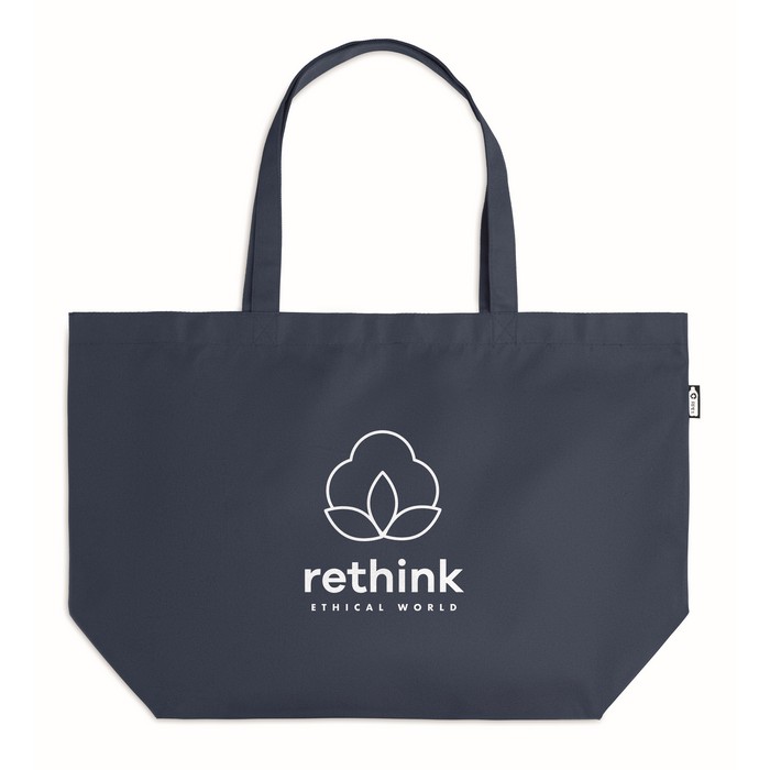 Large shopping bag or beach bag in 600D RPET with long handles and bottom gusset.