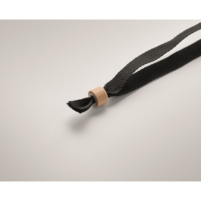 300D RPET polyester event wristband with bamboo ring closure. Wristband size 34 cm and 1,5 cm wide.