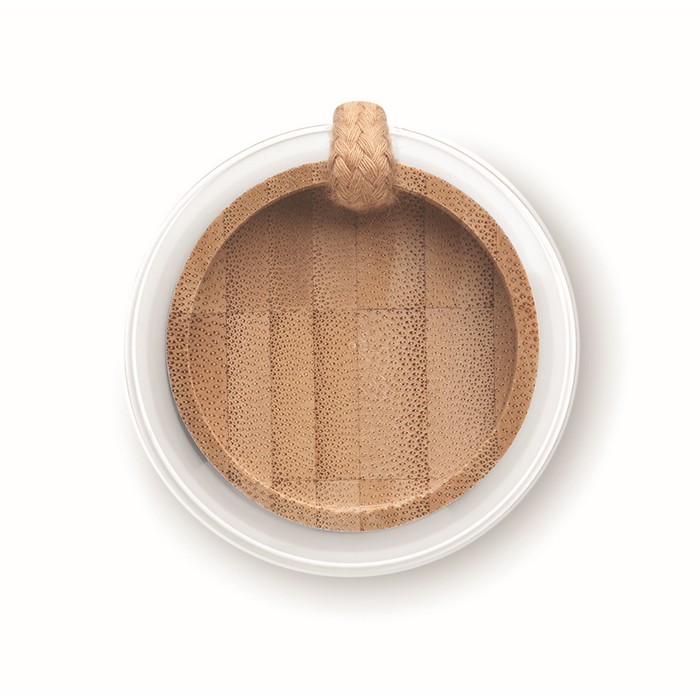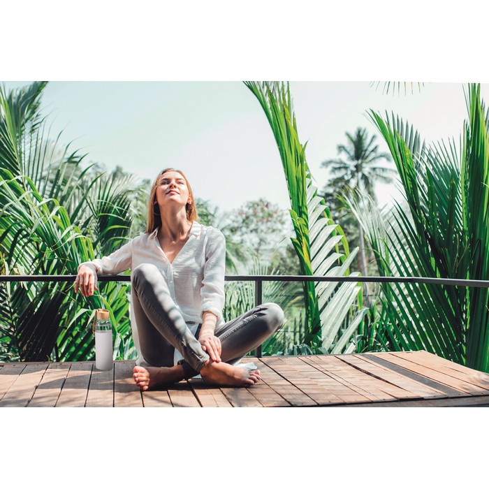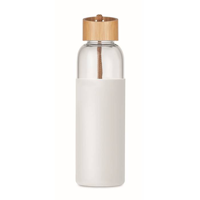Glass bottle with silicone pouch and bamboo lid with cotton wrist loop. Not suitable for carbonated drinks. Leak free. Capacity: 500 ml.Minimum quantity: