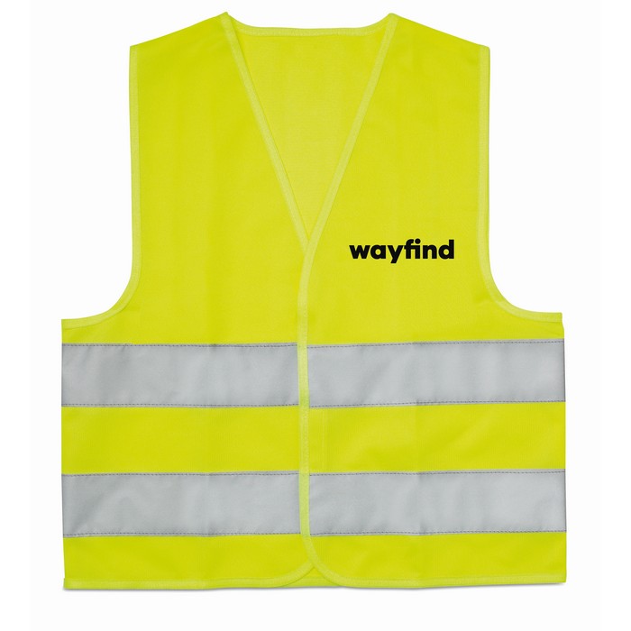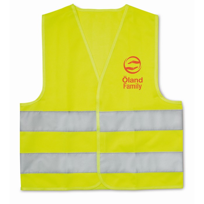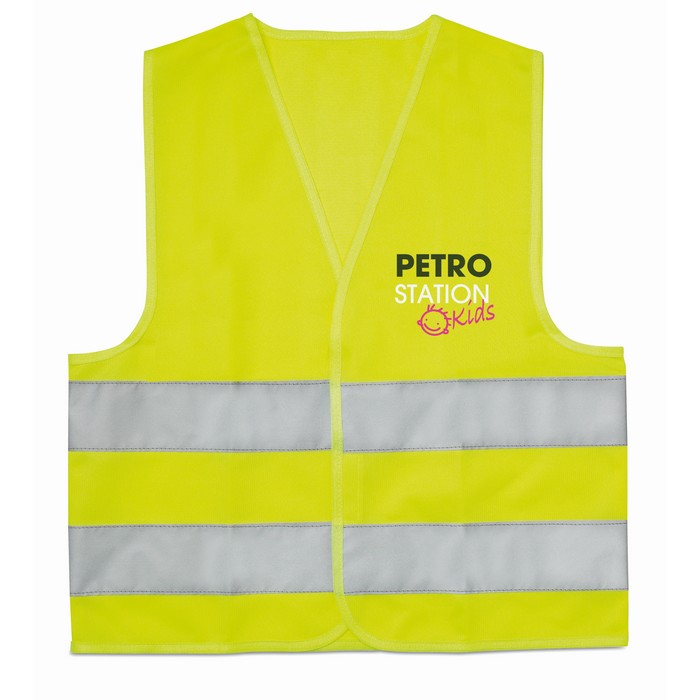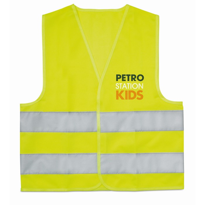 Child high visibility vest with 2 horizontal reflective bands. 100% polyester. EN17353.