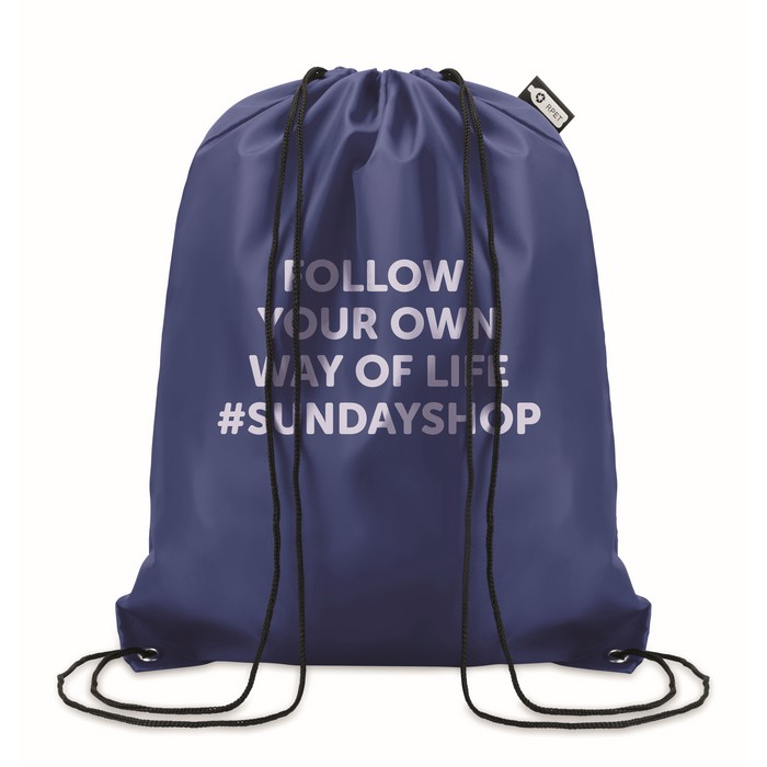 Drawstring bag in 190T RPET with PP strings. Eco-friendly material made from recycled plastic bottles.