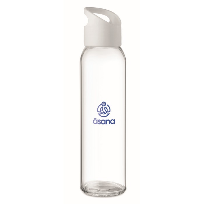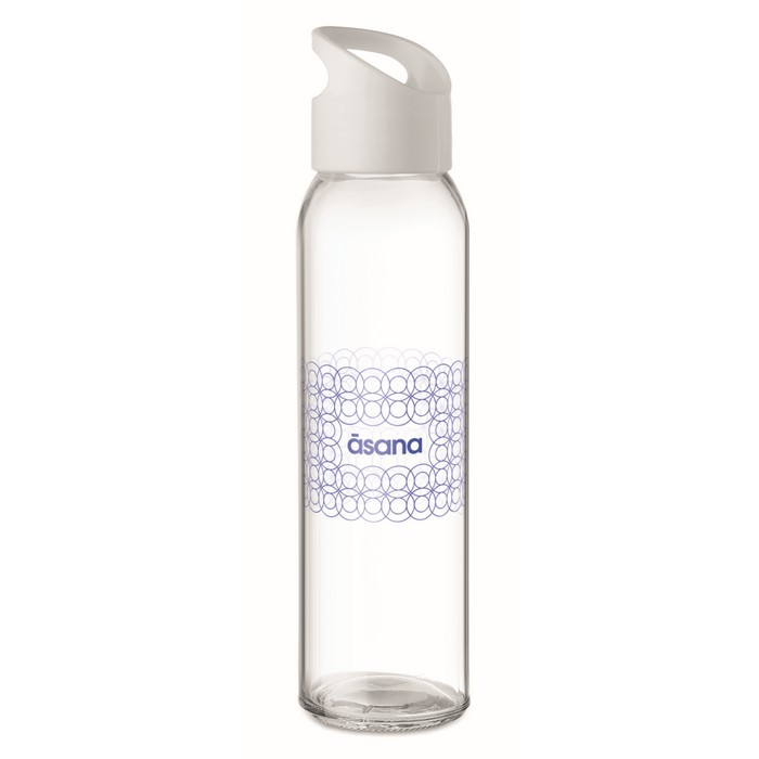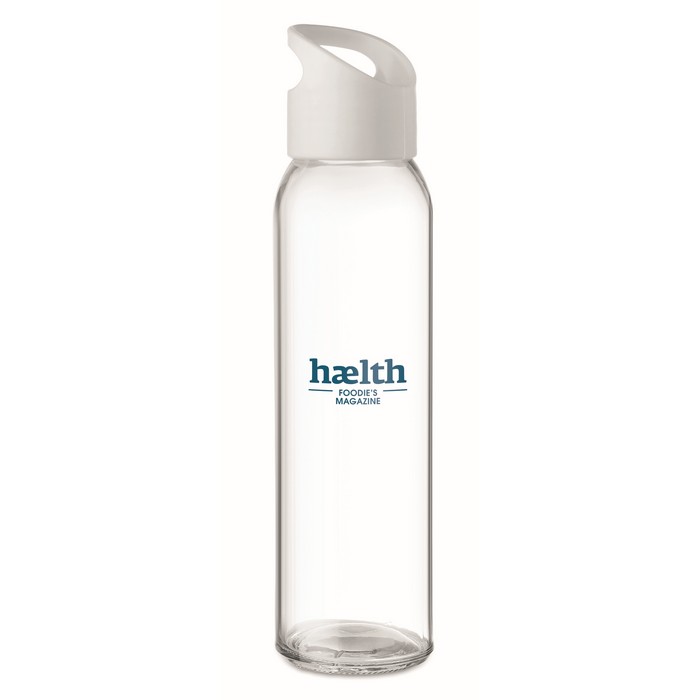Glass bottle with PP lid with hanging carrying loop. Capacity 470 ml. Not suitable for carbonated drinks. Leak free.