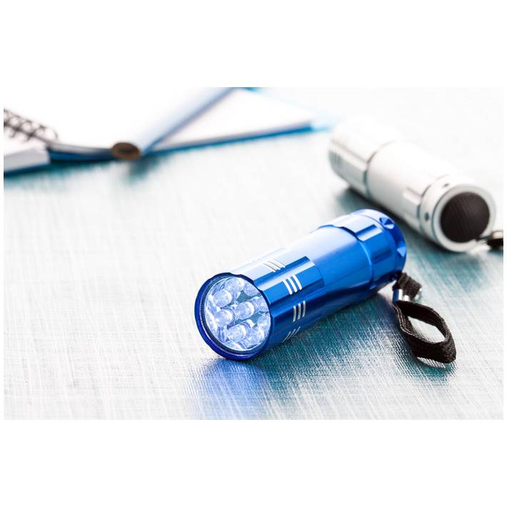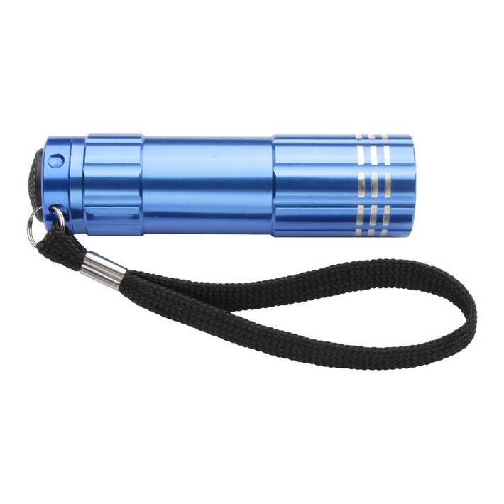 9 LED aluminium flashlight with carry strap. With 3 AAA batteries.