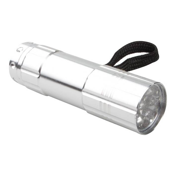 9 LED aluminium flashlight with carry strap. With 3 AAA batteries.