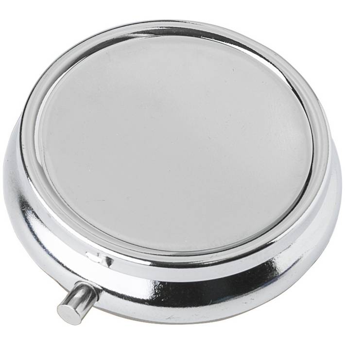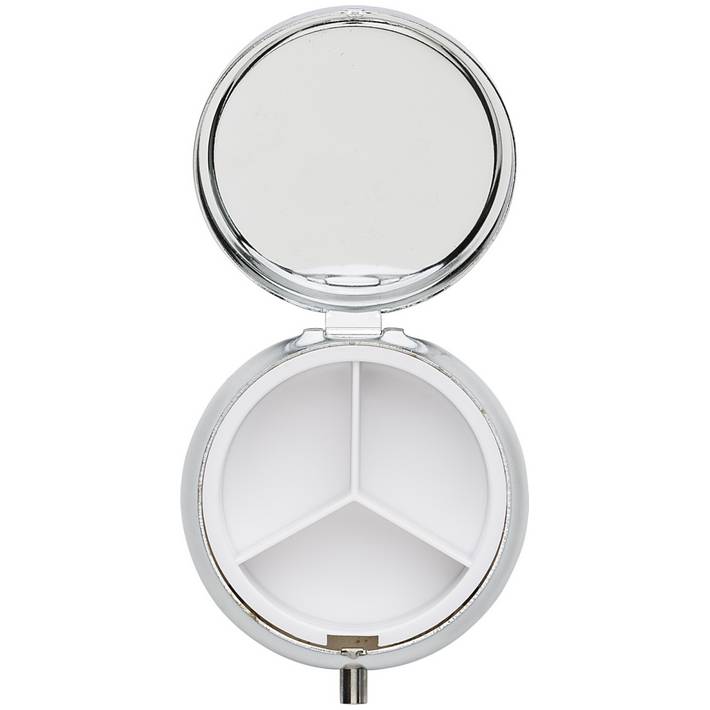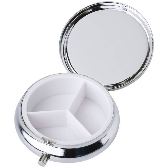 Portapillole 3 scomparti in ferro, interno in PP, interno lucido utilizzabile come specchio, confezionata singolarmente in una scatola biancaQuantità minima
