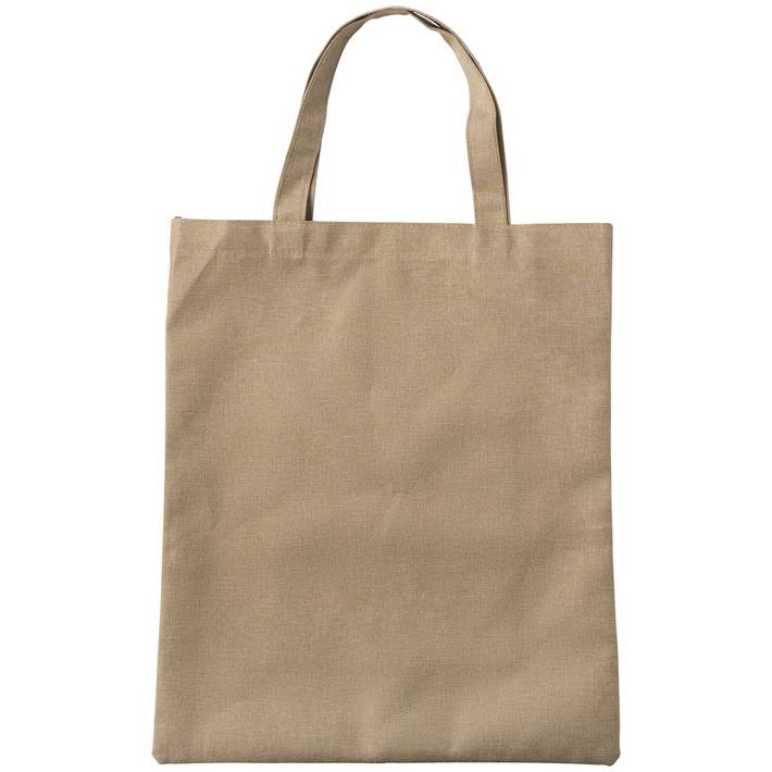Shopping bag in poliestere 600 D RPET, manici corti, base in sughero, colore naturale, piccola tasca sul davanti, etichetta RPETQuantità minima