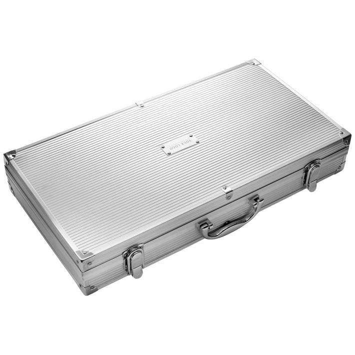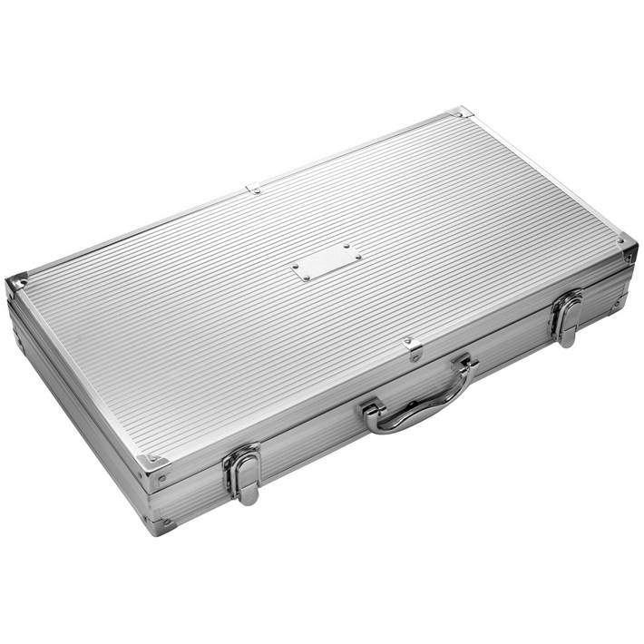 Set barbecue in valigetta di alluminio, 8 forchettine, spatole, 4 spiedi, coltello, forchettone, spatola con coltello, pinzaQuantità minima