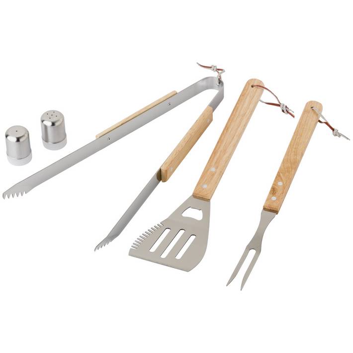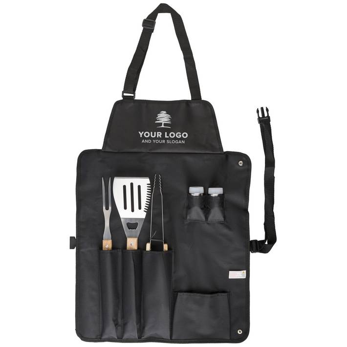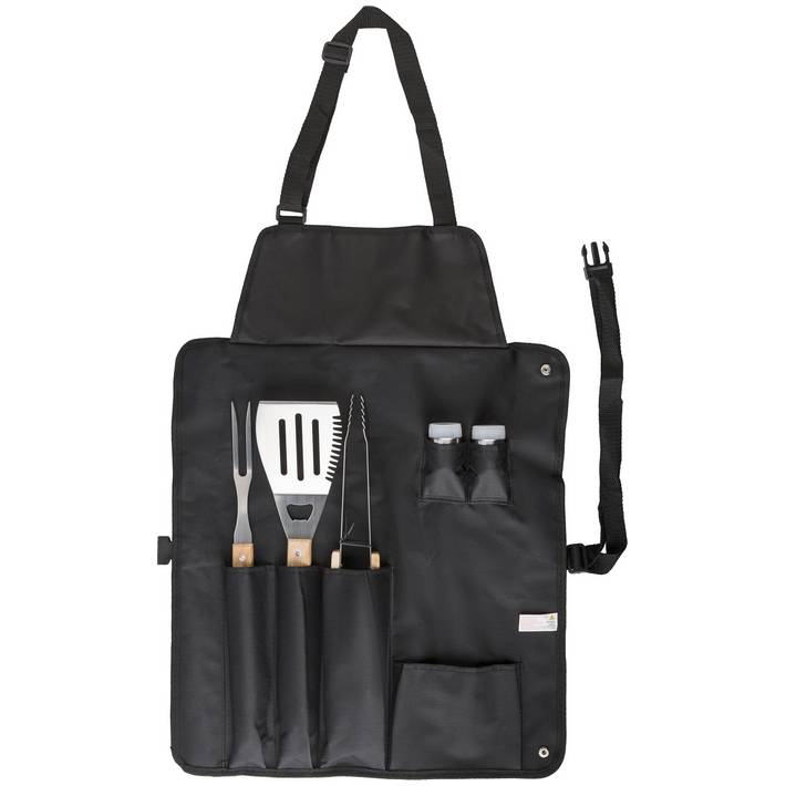 Set da barbecue composta da 6 elementi in acciaio inox, include grembiule in nylon 600 D in colore nero, forchettone, spatola, pinza e set sale e pepeQuantità minima