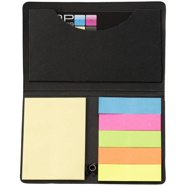 Set memo, composto da memo stick in vari colori, scomparti business cards all'interno, chiusura ad elastico