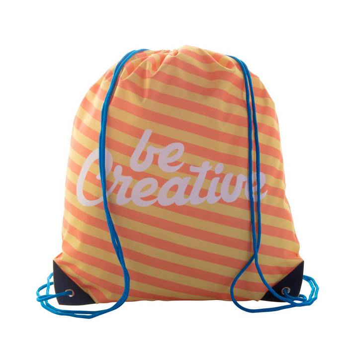 Sacca con chiusura a coulisse con angoli rinforzati in pelle PU e cordoncini in tinta, in poliestere 190T. Con grafica stampata in sublimazione su tutta la superficie. MOQ: 50 pezzi.Quantità minima