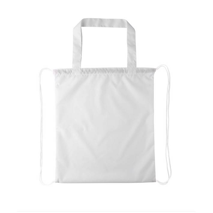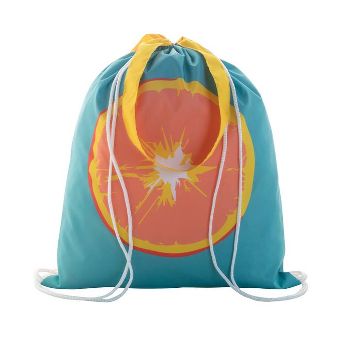 Sacca con chiusura a coulisse con cordoncini colorati e manici lunghi, in poliestere 190T. Può essere usata anche come borsa per la spesa. Con grafica stampata in sublimazione su tutta la superficie. MOQ: 50 pezzi.Quantità minima