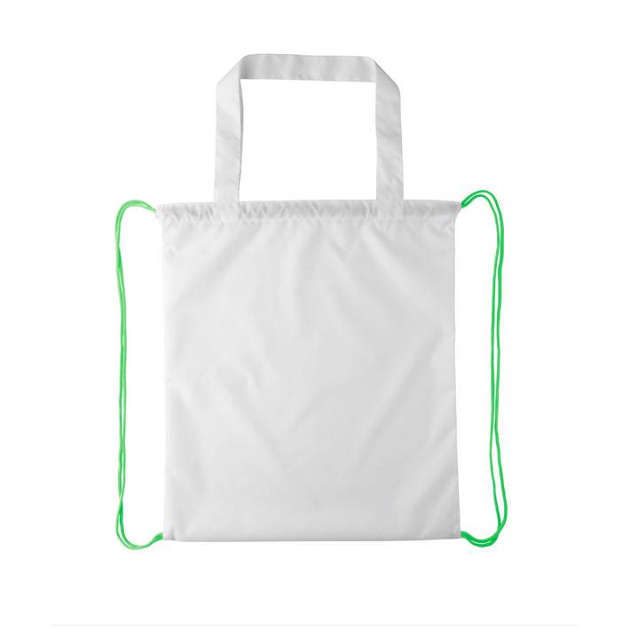 Sacca con chiusura a coulisse, cordoncini colorati e manici lunghi, in poliestere 190T. Può essere usata anche come borsa per la spesa. Con grafica stampata in sublimazione su tutta la superficie. MOQ: 50 pezzi.Quantità minima