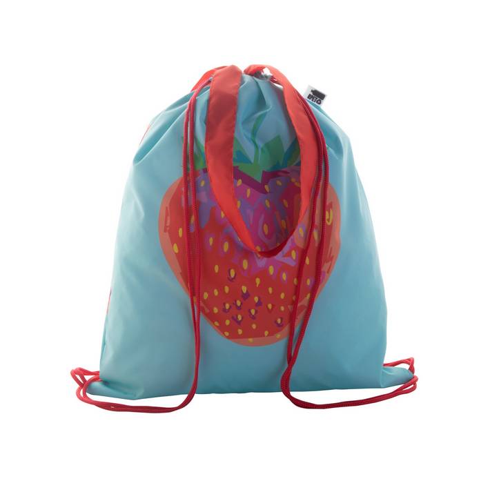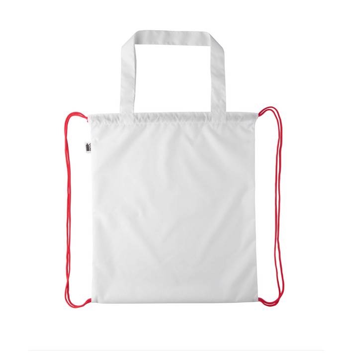 Sacca con chiusura a coulisse con cordoncini colorati e manici lunghi, in poliestere 190T RPET. Può essere usata anche come borsa per la spesa. Con grafica stampata in sublimazione su tutta la superficie ed etichetta RPET. MOQ: 50 pezzi.Quantità minima