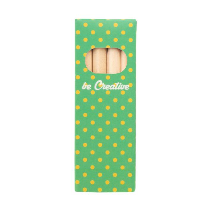 Matite colorate in legno (4 pezzi) in scatola di cartoncino kraft stampato a colori. Il prezzo include la stampa digitale. MOQ: 100 pezzi.Quantità minima