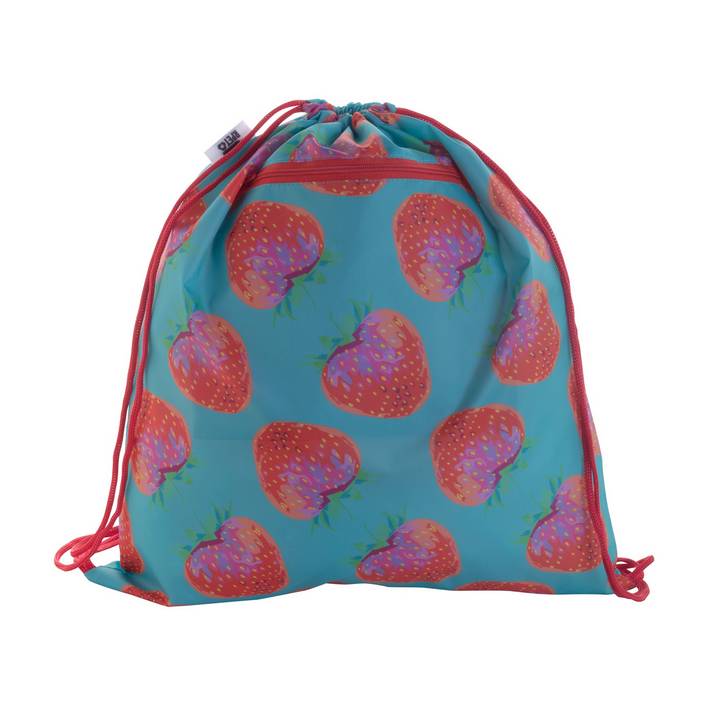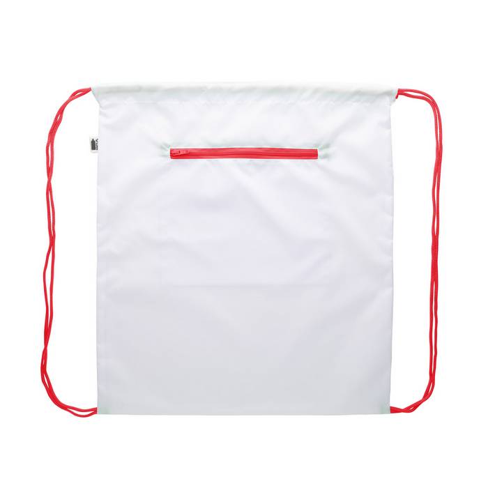 Sacca con coulisse personalizzabile in poliestere 190T, tasca frontale con zip e protezione RFID. Con grafica stampata in sublimazione su tutta la superficie ed etichetta RPET. MOQ: 50 pezziQuantità minima