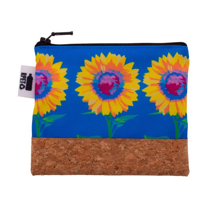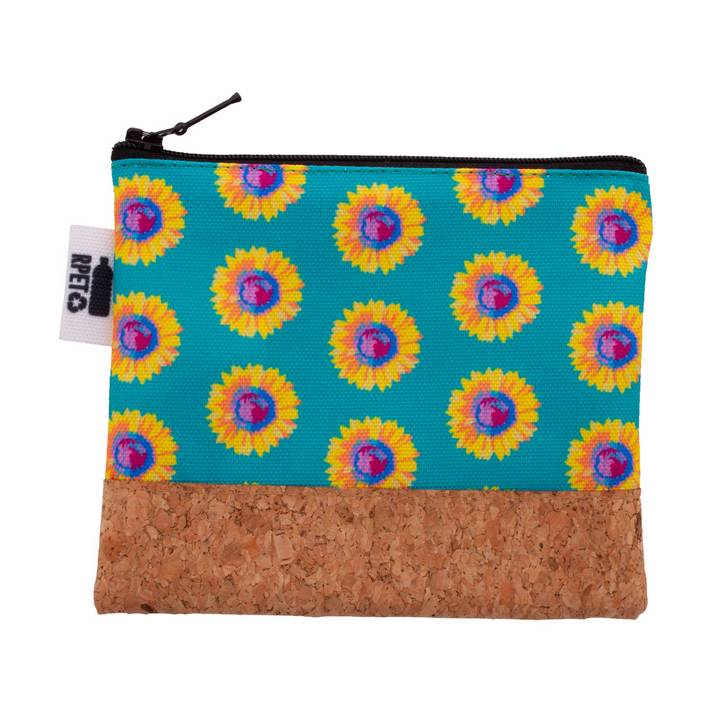 Trousse per cosmetici in poliestere 600D RPET e sughero, personalizzabile con grafica stampata in sublimazione su tutta la superficie e cerniera. MOQ: 50pz.Quantità minima