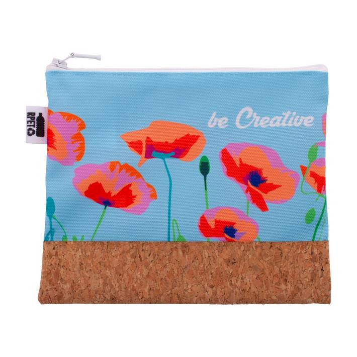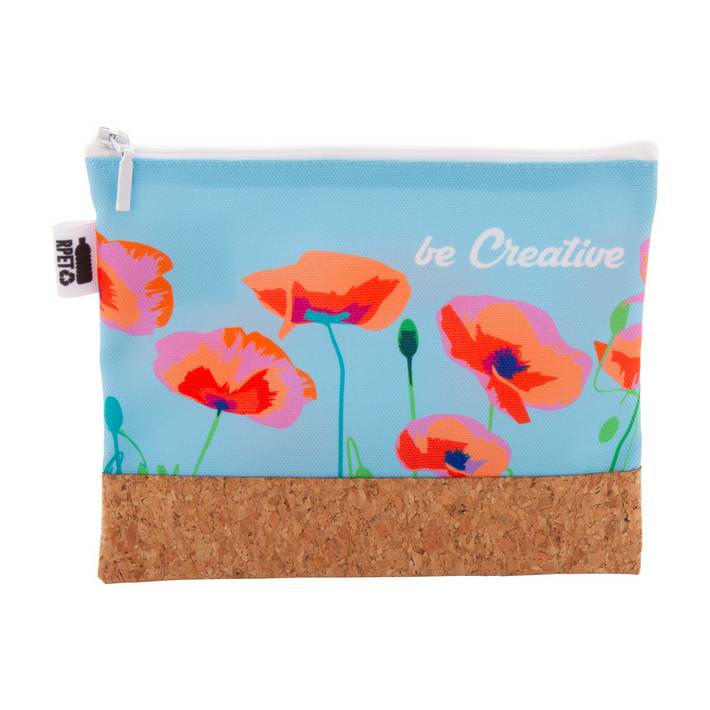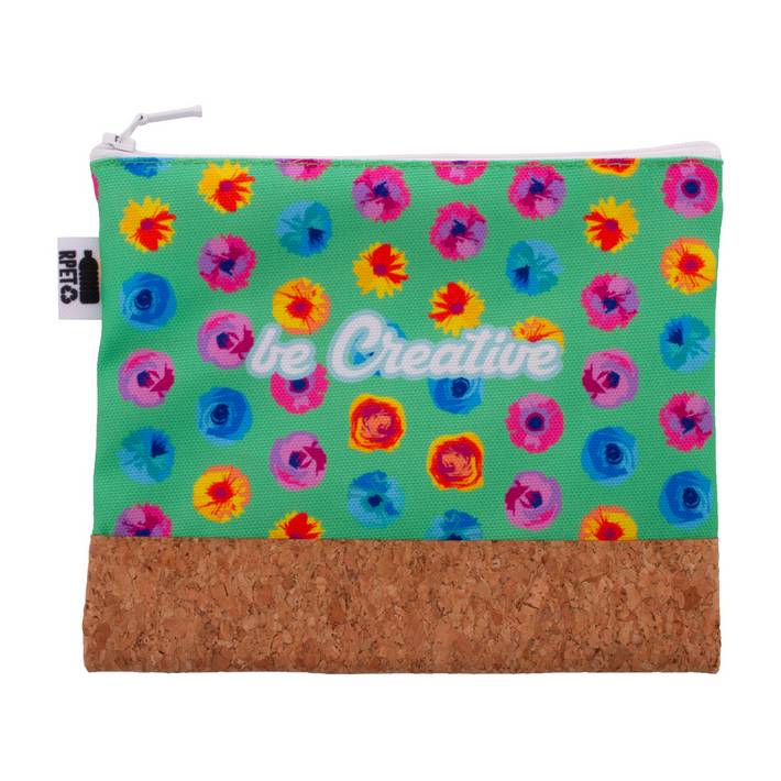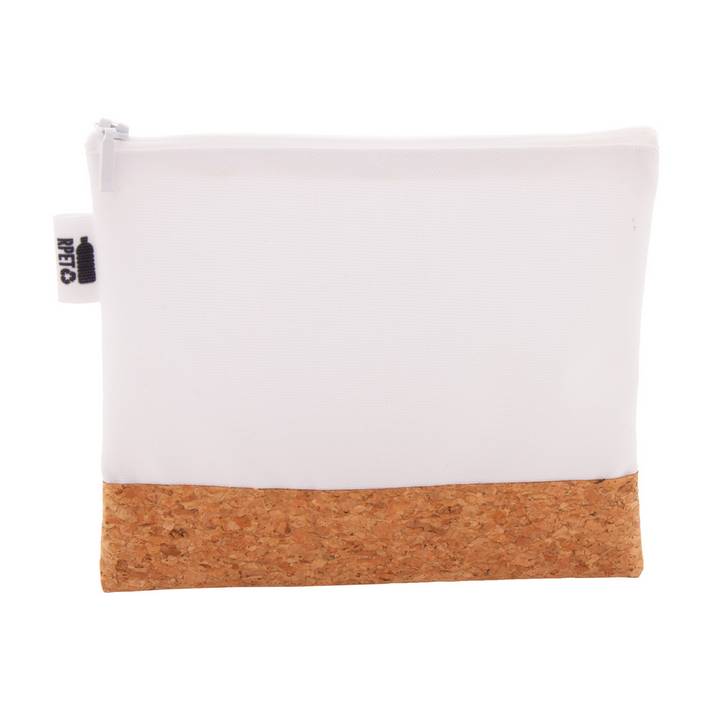 Trousse per cosmetici in poliestere 600D RPET e sughero, personalizzabile con grafica stampata in sublimazione su tutta la superficie e cerniera. MOQ: 50pz.Quantità minima