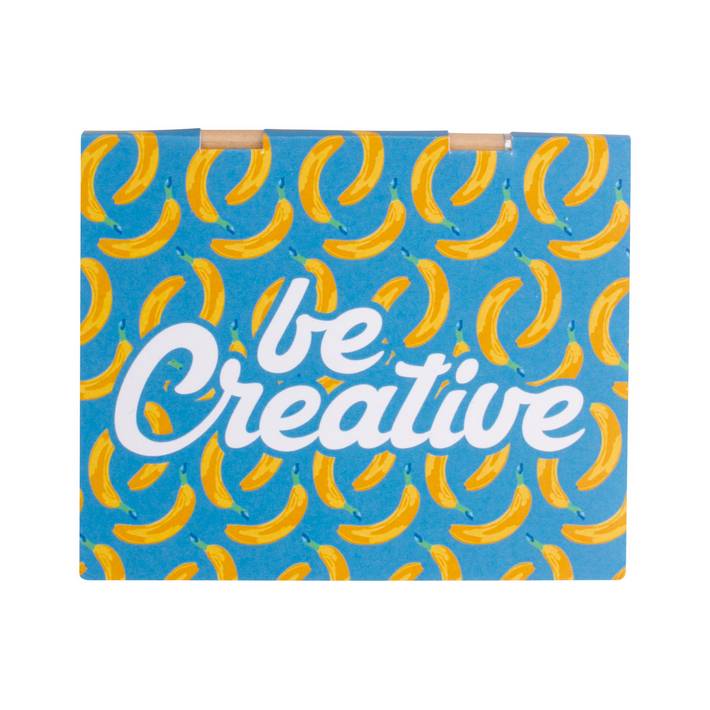 Blocco personalizzabile di foglietti adesivi, con copertina in carta e mini matita in legno. Il blocco comprende 75 foglietti adesivi in carta riciclata di 2 formati diversi (50 fogli da 100×75 mm, 25 fogli da 50×75 mm) e 100 segnapagina in film plastico in 5 colori assortiti (12×44 mm). Il costo comprende la copertina esterna stampata a colori. MOQ: 100 pezzi.Quantità minima